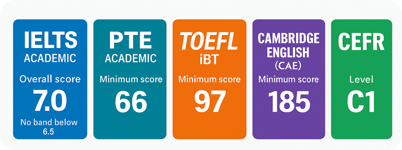 Cambridge English (CAE): Tối thiểu 185 điểm, tương đương trình độ C1 theo khung CEFR. Đây là chứng chỉ có giá trị lâu dài, được nhiều trường tại châu Âu và New Zealand công nhận.